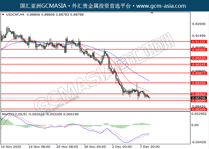 20201209 USDCHF-午间 by keyk | Dec 9, 2020 | 美元兑瑞士法郎 | 0 comments GCMAsia-USDCHF USDCHF 2020-12-09 USDCHF,H4:美瑞突破后持续下行。MACD动能持续略减,短期可关注空头为主。上方关注0.8895压力和0.8945压力,下方关注0.8870支撑和0.8830支撑。