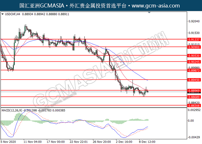 20201210 USDCHF-午间 by keyk | Dec 10, 2020 | 美元兑瑞士法郎 | 0 comments GCMAsia-USDCHF USDCHF 2020-12-10 USDCHF,H4:美瑞高位承压后回落。MACD动能持续略减,短期可关注空头为主。上方关注0.8895压力和0.8945压力,下方关注0.8870支撑和0.8830支撑。