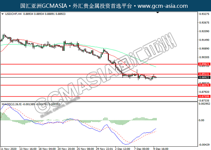 USDCHF,H4:美瑞震荡盘整,目前测试前期压力。MACD多头动能略增,若突破可关注多头为主。上方关注0.8915压力和0.8980压力,下方关注0.8835支撑和0.8760支撑。