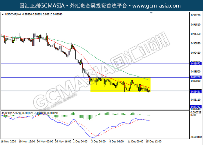 USDCHF,H4:美瑞仍区间震荡盘整,目前测试靠近前期支撑。然而,MACD显示空头信号,多头动能略减,若突破可关注空头走势为主。上方关注0.8920压力和0.8985压力,下方关注0.8850支撑和0.8775支撑。