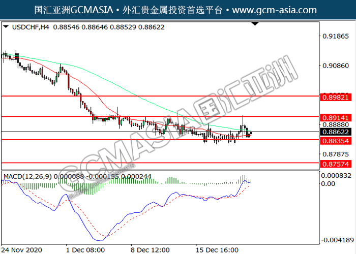 USDCHF,H4:美瑞高位回落,目前测试前期支撑。MACD多头动能略减,若下破可关注空头趋势为主。上方关注0.8915压力和0.8980压力,下方关注0.8835支撑和0.8755支撑。
