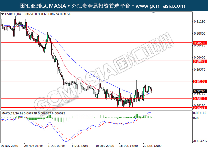 20201224 USDCHF by willy | Dec 24, 2020 | 美元兑瑞士法郎 | 0 comments GCMAsia-USDCHF USDCHF 2020-12-24 USDCHF,H4:美瑞高位承压后回落。MACD多头动能略减,短期可关注空头走势为主。上方关注0.8915压力和0.8985压力,下方关注0.8855支撑和0.8820支撑。