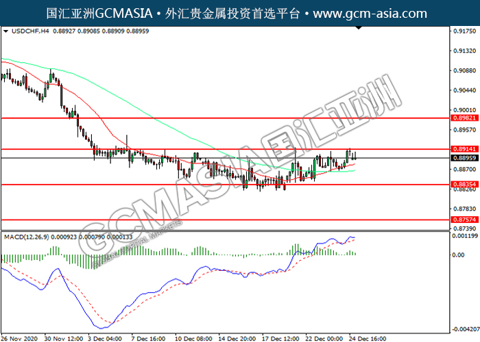 20201228 USDCHF-午间 by keyk | Dec 28, 2020 | 美元兑瑞士法郎 | 0 comments GCMAsia-USDCHF USDCHF 2020-12-28 USDCHF,H4:美瑞高位承压后回落。MACD多头动能略减,短期可关注空头走势为主。上方关注0.8915压力和0.8985压力,下方关注0.8835支撑和0.8755支撑。