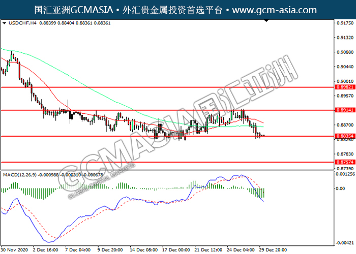 USDCHF,H4:美瑞高位承压后回落,目前测试前期支撑。MACD空头动能略增,若下破可关注空头走势为主。上方关注0.8915压力和0.8985压力,下方关注0.8835支撑和0.8755支撑。