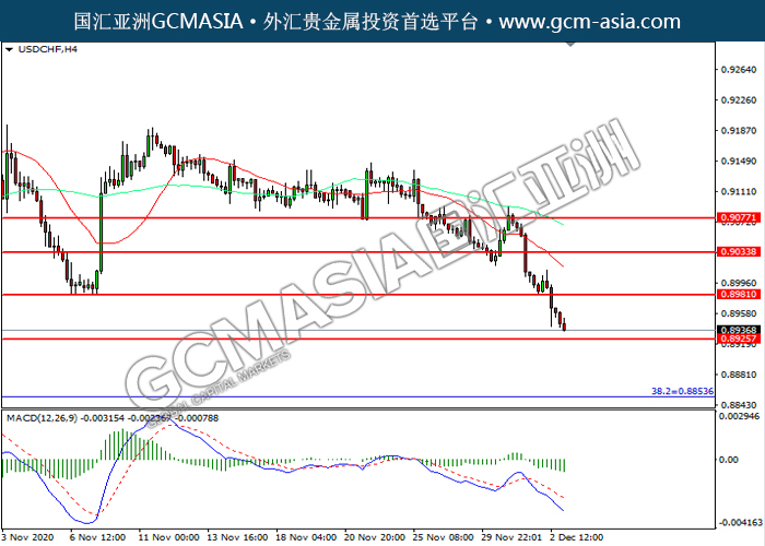 USDCHF,H4:美瑞震荡下行,目前测试前期支撑。MACD空头动能略增,若下破继续看空为主。上方关注0.8980压力和0.9035压力,下方关注0.8925支撑和0.8855支撑。