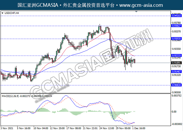 20210102 USDCHF-午间 by keyk | Dec 2, 2021 | 美元兑瑞士法郎 | 0 comments USDCHF,H4: 美瑞震荡盘整,目前测试靠近前期压力。然而,MACD形成金叉,动能略增,若突破可关注多头方向为主。上方关注0.9225压力和0.9300压力,下方关注0.9145支撑和0.9085支撑。