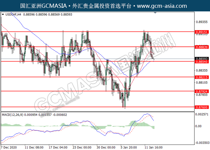 20210113 USDCHF by willy | Jan 13, 2021 | 美元兑瑞士法郎 | 0 comments GCMAsia-USDCHF USDCHF 2021-01-13 USDCHF,H4:美瑞突破后持续下行。MACD空头动能偏强,短期可关注空头为主。上方关注0.8885压力和0.8915压力,下方关注0.8855支撑和0.8820支撑。