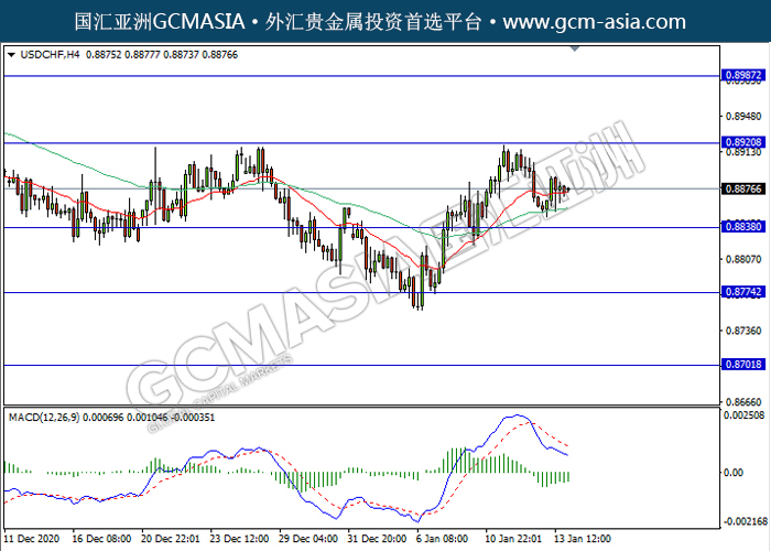 20210114 USDCHF by keyk | Jan 14, 2021 | 美元兑瑞士法郎 | 0 comments GCMAsia-USDCHF USDCHF 2021-01-14 USDCHF,H4:美瑞触底反弹上行。MACD空头动能开始略减,短期可继续关注多头反弹为主。上方关注0.8920压力和0.8985压力,下方关注0.8840支撑和0.8775支撑。