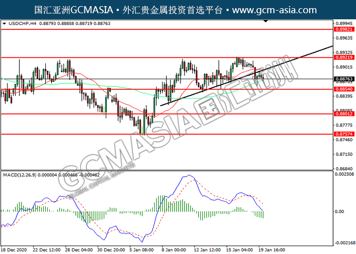 USDCHF,H4:美瑞近期高位承压回落。MACD显示空头信号,空头动能略增,短期可继续看空方向为主。上方关注0.8920压力和0.8980压力,下方关注0.8855支撑和0.8800支撑。