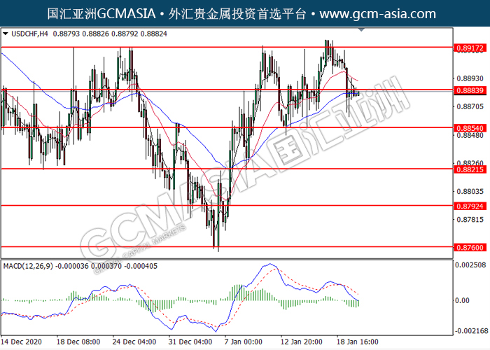 20210120 USDCHF by willy | Jan 20, 2021 | 美元兑瑞士法郎 | 0 comments GCMAsia-USDCHF USDCHF 2021-01-20 USDCHF,H4:美瑞突破后持续下行。然而,MACD空头动能略减,短期可关注技术性上调为主。上方关注0.8885压力和0.8915压力,下方关注0.8855支撑和0.8820支撑。