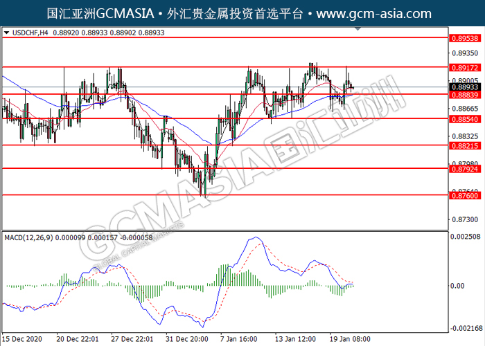 20210121 USDCHF by willy | Jan 21, 2021 | 美元兑瑞士法郎 | 0 comments GCMAsia-USDCHF USDCHF 2021-01-21 USDCHF,H4:美瑞高位承压后回落。然而,MACD空头动能略减,短期可关注技术性上调为主。上方关注0.8915压力和0.8955压力,下方关注0.8885支撑和0.8855支撑。