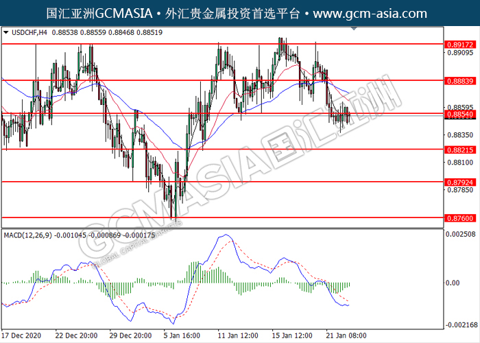 20210125 USDCHF by willy | Jan 25, 2021 | 美元兑瑞士法郎 | 0 comments GCMAsia-USDCHF USDCHF 2021-01-25 USDCHF,H4:美瑞震荡于压力位附近。MACD空头动能略减,短期可关注多头为主。上方关注0.8855压力和0.8885压力,下方关注0.8820支撑和0.8795支撑。