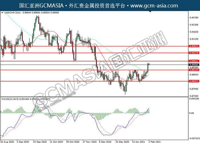 USDCHF,Daily:美瑞震荡上行,目前测试前期压力。MACD多头动能略增,若突破可关注多头为主。上方关注0.8980压力和0.9040压力,下方关注0.8920支撑和0.8845支撑。