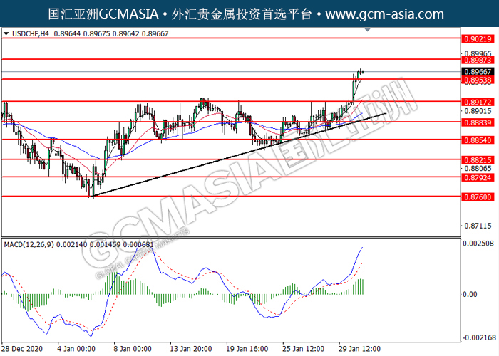 20210202 USDCHF by willy | Feb 2, 2021 | 美元兑瑞士法郎 | 0 comments GCMAsia-USDCHF USDCHF 2021-02-02 USDCHF,H4:美瑞突破后持续上行。MACD多头动能略增,短期可关注多头为主。上方关注0.8985压力和0.9020压力,下方关注0.8955支撑和0.8915支撑。