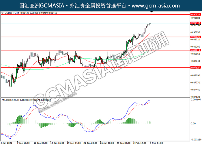 USDCHF,H4:美瑞震荡上行,目前测试前期压力。然而,MACD多头动能略减,短期关注多技术性回调为主。上方关注0.9045压力和0.9085压力,下方关注0.8980支撑和0.8920支撑。