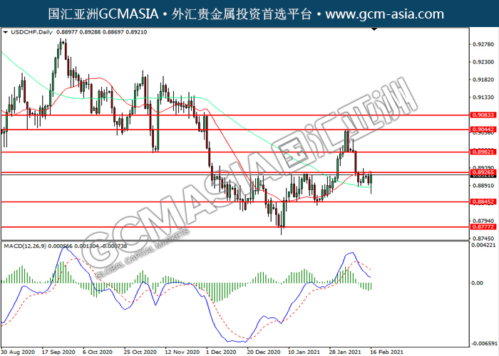 USDCHF,Daily:美瑞震荡盘整,目前测试前期压力。MACD空头动能持续略减,若突破可关注多头为主。上方关注0.8925压力和0.8980压力,下方关注0.8845支撑和0.8775支撑。