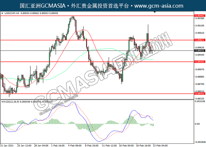 20210223 USDCHF-午间 by keyk | Feb 23, 2021 | 美元兑瑞士法郎 | 0 comments GCMAsia-USDCHF USDCHF 2021-02-23 USDCHF,H4:美瑞高位承压回落。MACD空头动能持续略增,短期可关注空头为主。上方关注0.8980压力和0.9045压力,下方关注0.8925支撑和0.8845支撑。