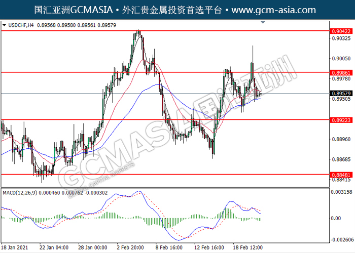 20210223 USDCHF by willy | Feb 23, 2021 | 美元兑瑞士法郎 | 0 comments GCMAsia - USDCHF USDCHF 2021-02-23 USDCHF,H4:美瑞低位反弹。MACD空头动能略减,短期可关注多头为主。上方关注0.8985压力和0.9040压力,下方关注0.8920支撑和0.8850支撑。