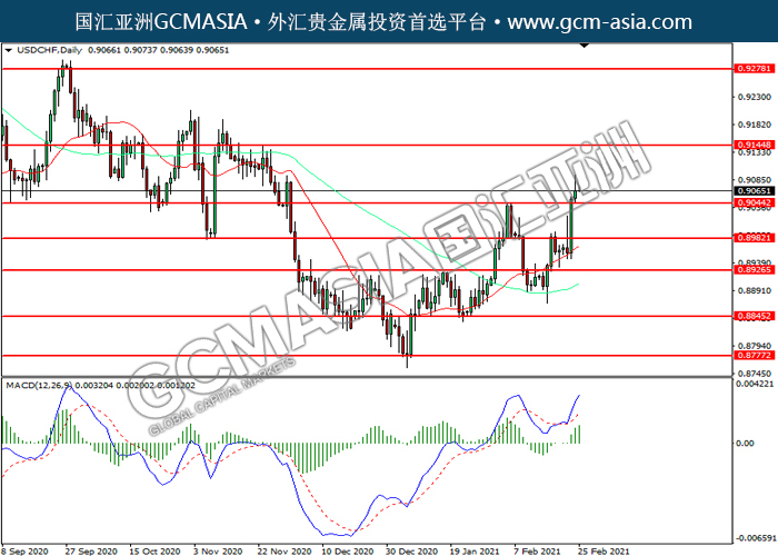 USDCHF,Daily:美瑞突破前期压力,震荡上行。MACD多头动能持续略增,短期可关注多头为主。上方关注0.9145压力和0.9280压力,下方关注0.9045支撑和0.8980支撑。