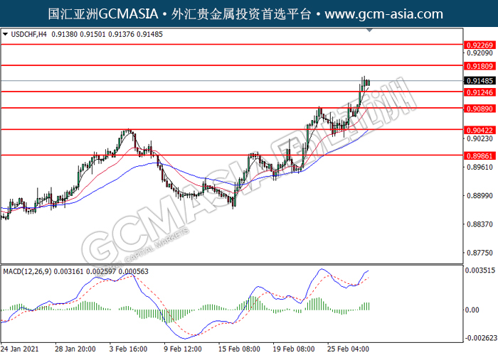 20210302 USDCHF by willy | Mar 2, 2021 | 美元兑瑞士法郎 | 0 comments GCMAsia - USDCHF USDCHF 2021-03-02 USDCHF,H4:美瑞突破后持续上行。MACD多头动能偏强,短期可关注多头趋势为主。上方关注0.9180压力和0.9225压力,下方关注0.9125支撑和0.9090支撑。