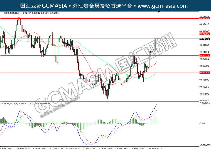 20210303 USDCHF_午间 by keyk | Mar 3, 2021 | 美元兑瑞士法郎 | 0 comments GCMAsia-USDCHF USDCHF 2021-03-03 USDCHF,H4:美瑞震荡上行,目前测试前期压力。MACD多头动能略增,若突破继续看多为主。上方关注0.9180压力和0.9280压力,下方关注0.9040支撑和0.8925支撑。