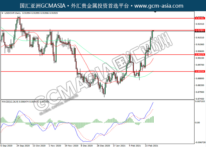 USDCHF,Daily:美瑞震荡上行,目前测试前期压力。MACD多头动能略增,若突破继续看多为主。上方关注0.9200压力和0.9280压力,下方关注0.9040支撑和0.8925支撑。