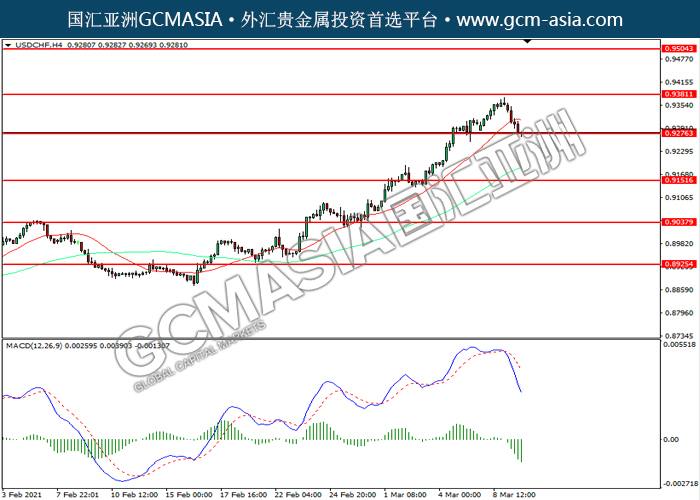 USDCHF,H4:美瑞震荡下行,目前测试前期支撑。MACD空头动能略增,若下破可关注空头为主。上方关注0.9380压力和0.9505压力,下方关注0.9275支撑和0.9150支撑。