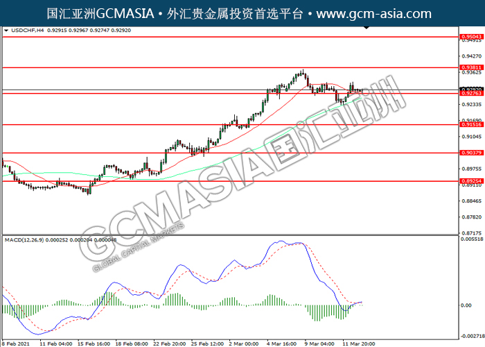 20210315 USDCHF-午间 by willy | Mar 15, 2021 | 美元兑瑞士法郎 | 0 comments USDCHF,H4:美瑞震荡下行,目前测试前期支撑。然而,MACD空头动能略减,短期可关注技术性回调为主。上方关注0.9380压力和0.9505压力,下方关注0.9275支撑和0.9150支撑。