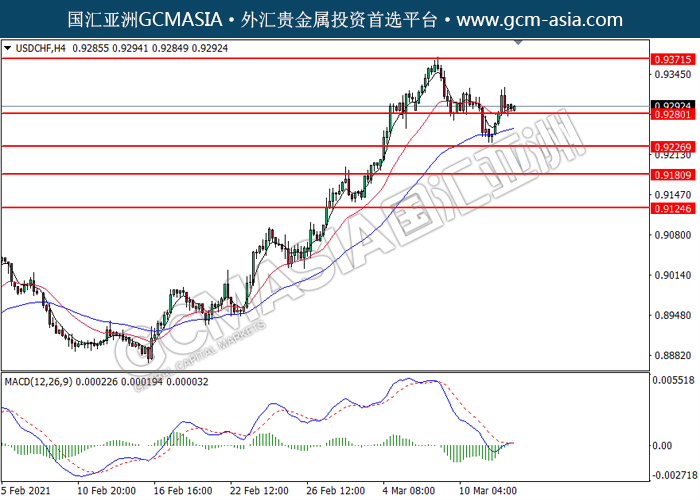 USDCHF,H4:美瑞高位承压后回落,目前测试着支撑位。然而,MACD转向多头,多头动能略增,短期可关注多头为主。上方关注0.9370压力和0.9430压力,下方关注0.9280支撑和0.9225支撑。