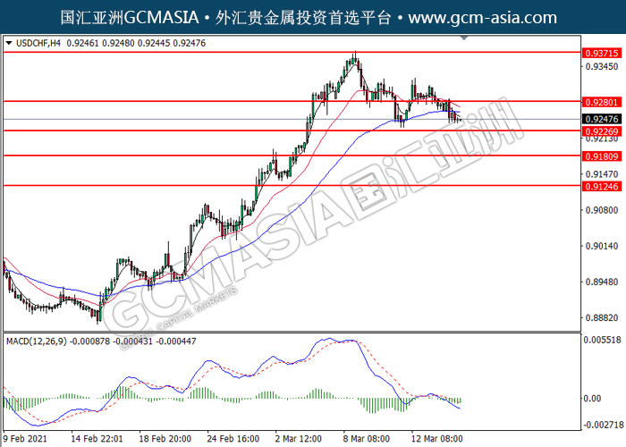 USDCHF,H4:美瑞突破后持续下行。MACD转向空头,多头动能略减,短期可关注空头为主。上方关注0.9280压力和0.9370压力,下方关注0.9225支撑和0.9180支撑。