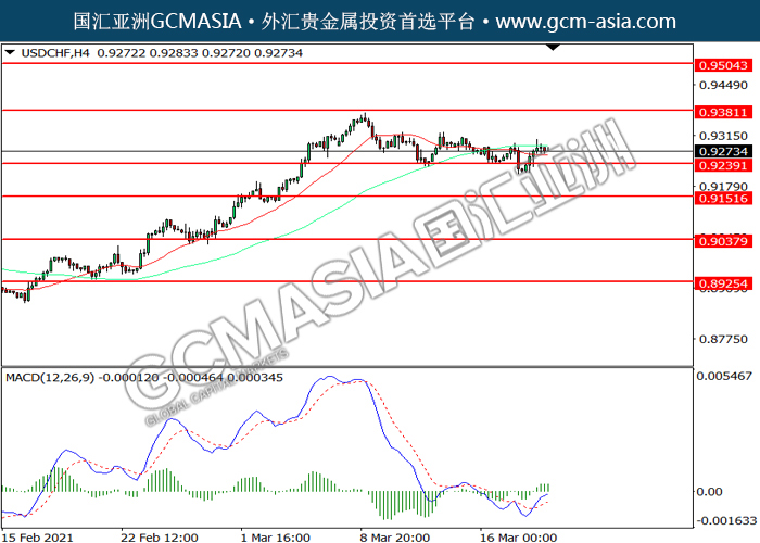USDCHF,H4:美瑞目前震荡盘整,目前靠近前期支撑。然而,MACD多头动能略增,短期可关注多头为主。上方关注0.9380压力和0.9505压力,下方关注0.9240支撑和0.9150支撑。