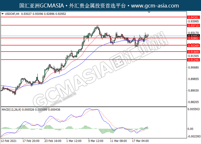 20210322 USDCHF by willy | Mar 21, 2021 | 美元兑瑞士法郎 | 0 comments GCMAsia - USDCHF USDCHF 2021-03-22 USDCHF,H4:美瑞突破后持续上行。MACD转向多头,多头动能略增,短期可关注多头为主。上方关注0.9370压力和0.9430压力,下方关注0.9280支撑和0.9225支撑。