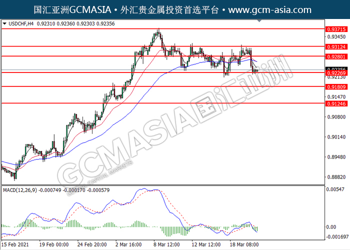 20210323 USDCHF by willy | Mar 23, 2021 | 美元兑瑞士法郎 | 0 comments GCMAsia - USDCHF USDCHF 2021-03-23 USDCHF,H4:美瑞突破后持续下行。MACD转向空头,动能略减,短期可关注空头为主。上方关注0.9280压力和0.9310压力,下方关注0.9225支撑和0.9180支撑。