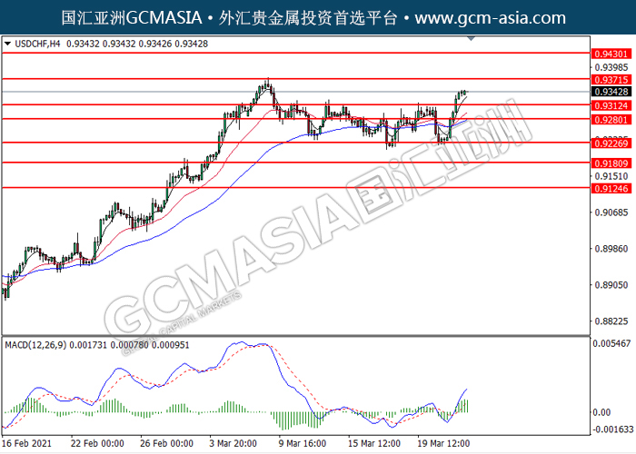 20210324 USDCHF by willy | Mar 24, 2021 | 美元兑瑞士法郎 | 0 comments GCMAsia - USDCHF USDCHF 2021-03-24 USDCHF,H4:美瑞突破后持续上行。MACD转向多头,动能略增,短期可关注多头为主。上方关注0.9370压力和0.9430压力,下方关注0.9310支撑和0.9280支撑。