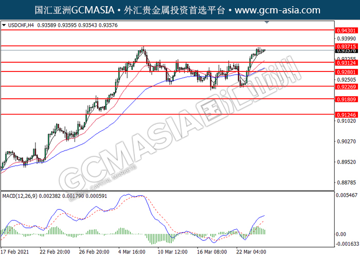 USDCHF,H4:美瑞突破后持续上行,目前测试着压力位。然而,MACD转向空头,动能略减,短期可关注空头回调。上方关注0.9370压力和0.9430压力,下方关注0.9310支撑和0.9280支撑。