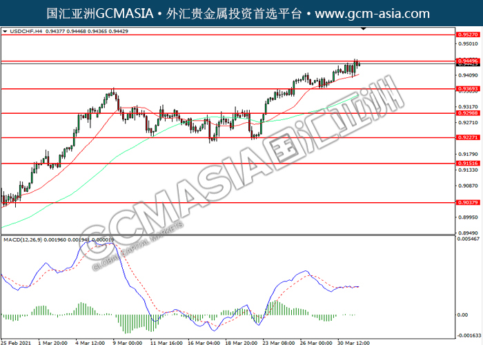 20210401 USDCHF-午间 by keyk | Apr 1, 2021 | 美元兑瑞士法郎 | 0 comments GCMAsia-USDCHF USDCHF 2021-04-01 USDCHF,H4:美瑞震荡上行,目前测试前期压力。MACD空头动能略减,若突破关注多头为主。上方关注0.9450压力和0.9525压力,下方关注0.9370支撑和0.9300支撑。