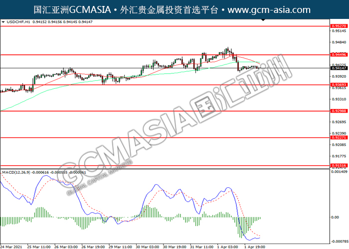 20210402 USDCHF-午间 by keyk | Apr 2, 2021 | 美元兑瑞士法郎 | 0 comments GCMAsia-USDCHF USDCHF 2021-04-02 USDCHF,H4:美瑞高位回落。然而,MACD空头动能略减,短期可关注技术性回调为主。上方关注0.9450压力和0.9525压力,下方关注0.9370支撑和0.9300支撑。
