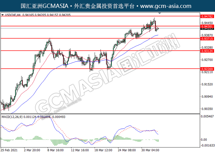 20210402 USDCHF by willy | Apr 2, 2021 | 美元兑瑞士法郎 | 0 comments GCMAsia - USDCHF USDCHF 2021-04-02 USDCHF,H4:美瑞低位反弹。MACD显示空头动能偏强,短期可关注技术性回调。上方关注0.9430压力和0.9480压力,下方关注0.9370支撑和0.9310支撑。