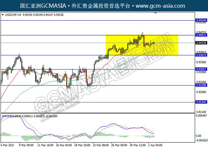 USDCHF,H4:美瑞仍区间震荡盘整。然而,MACD显示多头信号,空头动能开始略减,短期可关注多头为主。上方关注0.9455压力和0.9525压力,下方关注0.9365支撑和0.9300支撑。