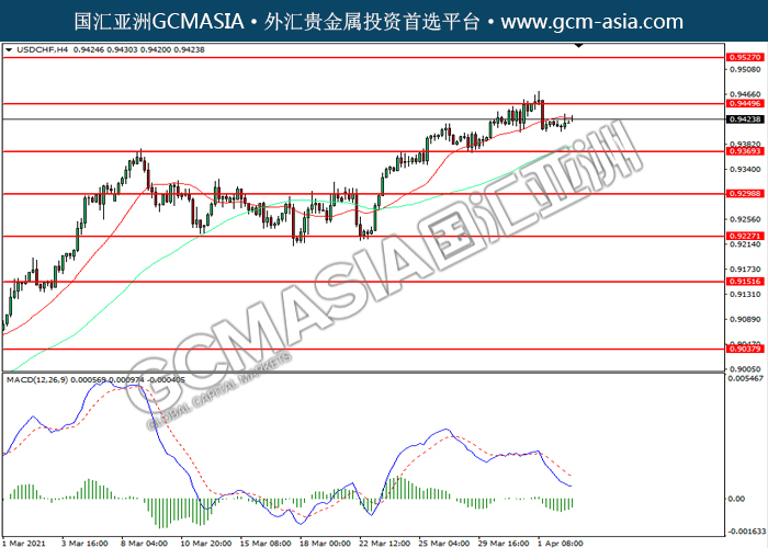 USDCHF,H4:美瑞高位回落。然而,MACD空头动能略减,短期可关注技术性回调为主。上方关注0.9450压力和0.9525压力,下方关注0.9370支撑和0.9300支撑。