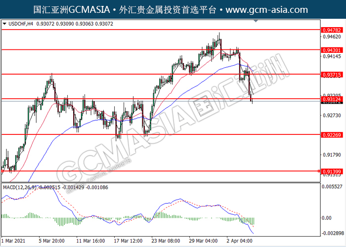 USDCHF,H4:美瑞突破后持续下行。MACD显示空头动能偏强,短期可关注空头趋势。上方关注0.9310压力和0.9370压力,下方关注0.9225支撑和0.9140支撑。