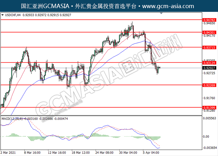 USDCHF,H4:美瑞突破后持续下行。然而,MACD显示空头动能略减,短期可关注技术性反弹。上方关注0.9310压力和0.9370压力,下方关注0.9225支撑和0.9140支撑。