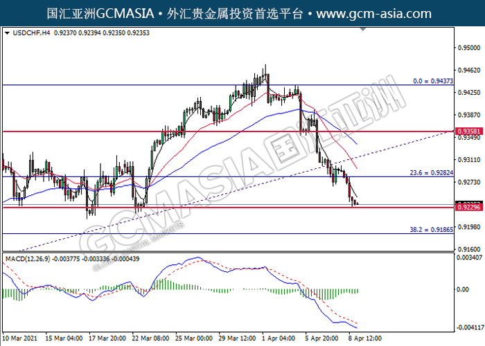 USDCHF,H4:美瑞突破后持续下行,目前测试着支撑位。MACD显示空头动能略增,若突破可关注空头趋势。上方关注0.9280压力和0.9360压力,下方关注0.9330支撑和0.9185支撑。