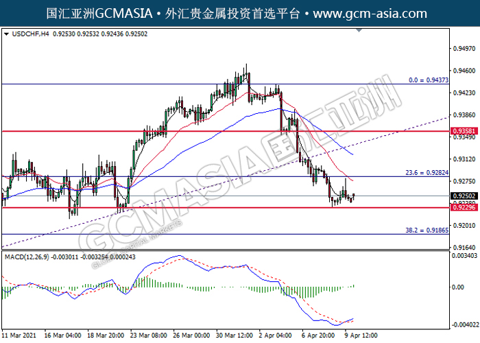 USDCHF,H4:美瑞突破后持续下行,目前测试着支撑位附近。然而,MACD显示多头动能略增,短期可关注技术性回调。上方关注0.9280压力和0.9360压力,下方关注0.9330支撑和0.9185支撑。