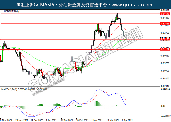 USDCHF,Daily:美瑞高位承压回落,目前测试前期支撑。MACD显示空头动能略增,若突破可关注空头趋势。上方关注0.9365压力和0.9465压力,下方关注0.9210支撑和0.9110支撑。