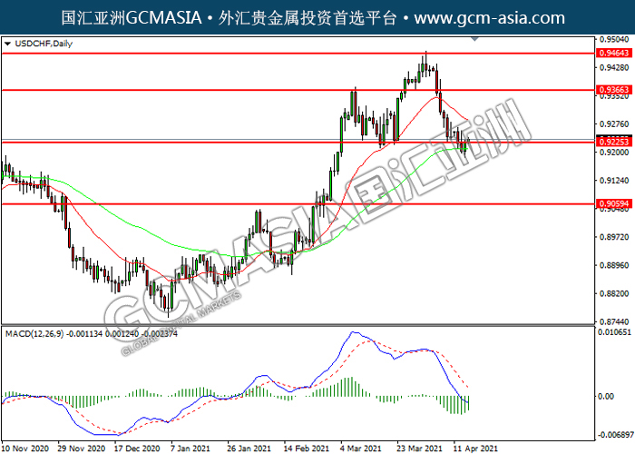 USDCHF,Daily:美瑞震荡下行,目前测试前期支撑。然而,MACD显示空头动能略减,短期可关注技术性回调为主。上方关注0.9365压力和0.9465压力,下方关注0.9225支撑和0.9060支撑。