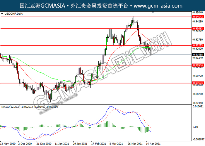 USDCHF,Daily:美瑞下破前期支撑,震荡下行。然而,MACD显示空头动能略减,短期可关注技术性回调为主。上方关注0.9225压力和0.9365压力,下方关注0.9060支撑和0.8910支撑。