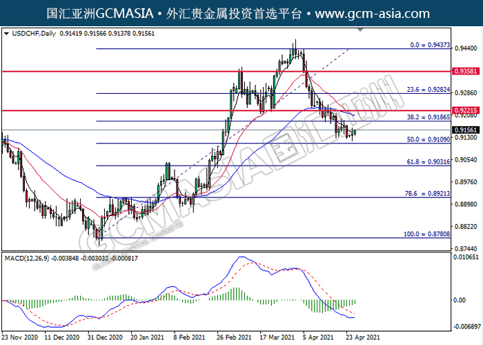 20210427 USDCHF-午间 by willy | Apr 27, 2021 | 美元兑瑞士法郎 | 0 comments GCMAsia-USDCHF USDCHF 2021-04-27 USDCHF,Daily:美瑞低位反弹。MACD显示空头动能略减,短期可关注多头趋势。上方关注0.9185压力和0.9220压力,下方关注0.9110支撑和0.9030支撑。
