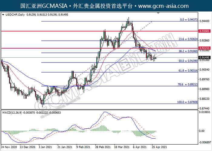 20210428 USDCHF-午间 by willy | Apr 28, 2021 | 美元兑瑞士法郎 | 0 comments GCMAsia-USDCHF USDCHF 2021-04-28 USDCHF,Daily:美瑞低位反弹。MACD显示空头动能略减,短期可关注多头趋势。上方关注0.9185压力和0.9220压力,下方关注0.9110支撑和0.9030支撑。