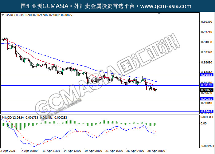 USDCHF,H4:美瑞突破前期支撑后震荡盘整。然而,MACD空头动能有所略减,短期关注技术性多头反弹趋势为主。上方关注0.9115压力和0.9185压力,下方关注0.9030支撑和0.8945支撑。